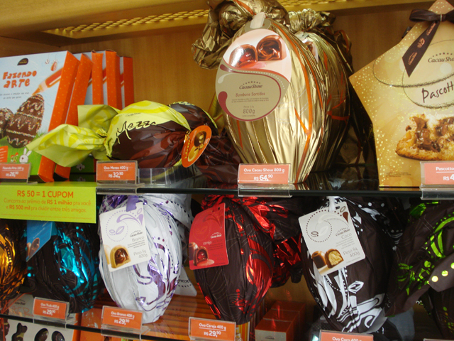 Os preços variam de R$ 5 a R$ 950 (com recheios e até brinquedos em seu interior). O domingo de páscoa será dia 31 de março. No entanto, muitas lojas já estão decoradas e vendendo ovos.