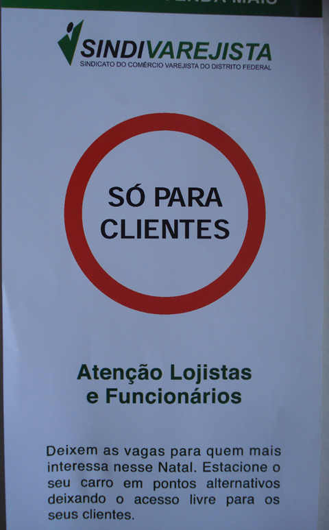 O Sindicato do Comércio Varejista lançou campanha para aumentar o número de vagas para carros de consumidores no comércio de rua do Distrito Federal. Ele está distribuindo em lojas pequenos folders em que se lê: Só para Clientes. Atenção Lojistas e Funcionários. Deixem as vagas para quem mais interesse nesse Natal. Estacione o seu carro em pontos alternativos deixando o acesso livre para os seus clientes.