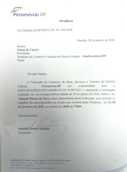 Consoante o disposto na Portaria/Pres/Fecomércio-DF 005/2017, e também, disposições estatutárias tanto da Fecomércio como do Sindivarejista, vimos solicitar a Vossa Senhoria a gentileza de designar um representante dessa Federação para participar da Mesa Apuradora de votos nas eleições que serão realizadas no dia 8 de fevereiro do corrente, no horário de 14 à 17 horas