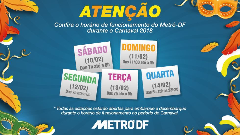 Veja o horário de funcionamento do Metrô-DF durante o carnaval 2018