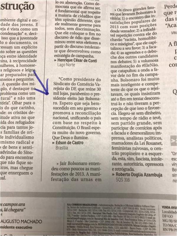 Seção Cartas dos Leitores: Carta do presidente do Sindivarejista, Edson de Castro, sobre Jair Bolsonaro.