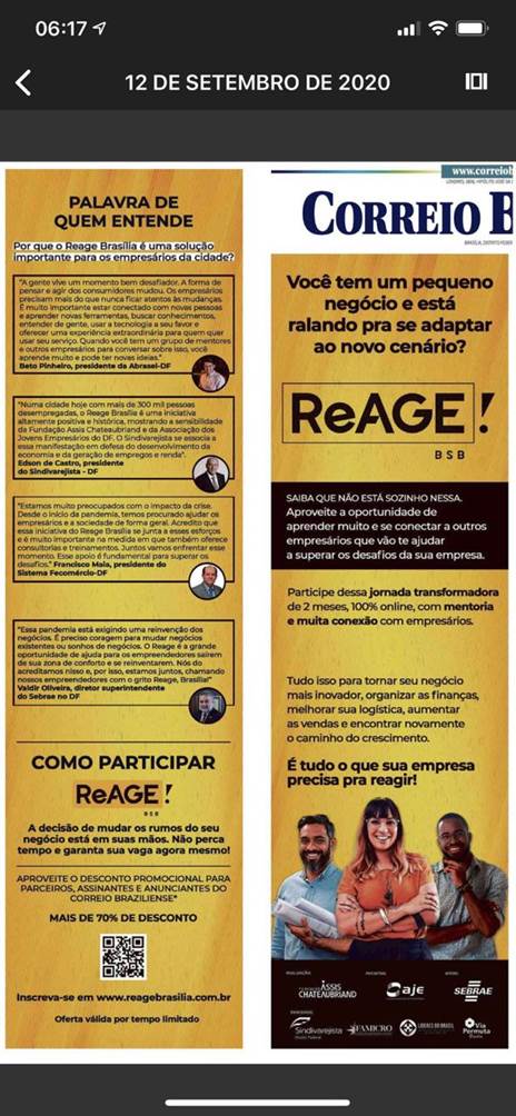 Anúncio do programa Reage Brasília. Fotos e depoimentos de líderes empresariais incluindo o presidente do Sindivarejista, Edson de Castro.
