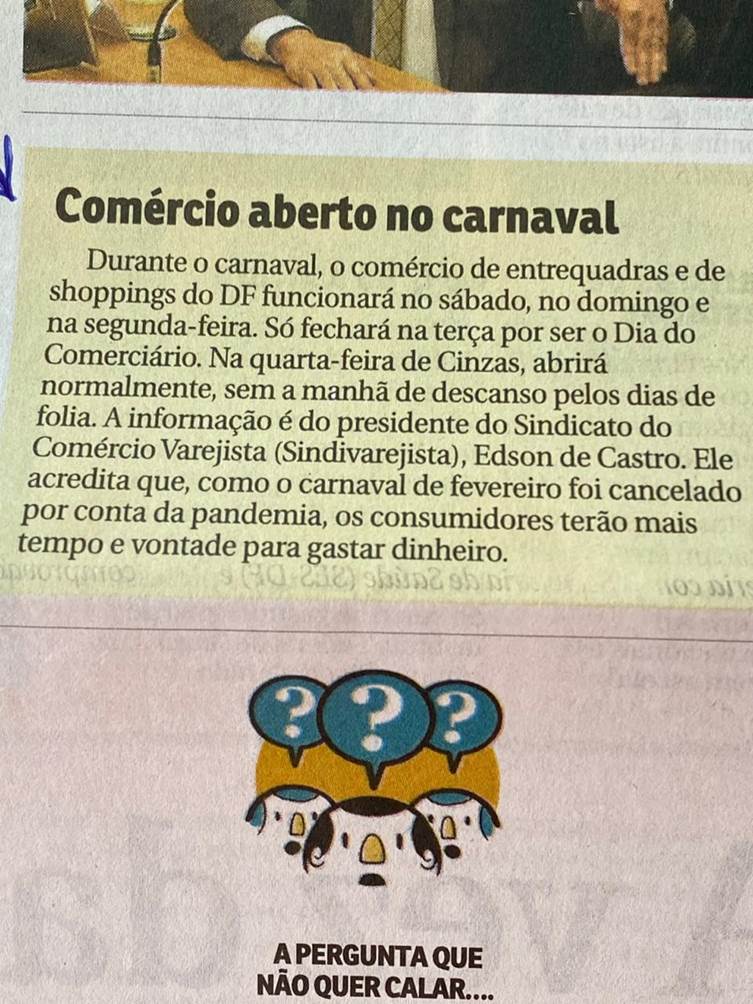 Coluna Eixo Capital: Nota sobre abertura do comércio no carnaval. Presidente do Sindivarejista é mencionado.