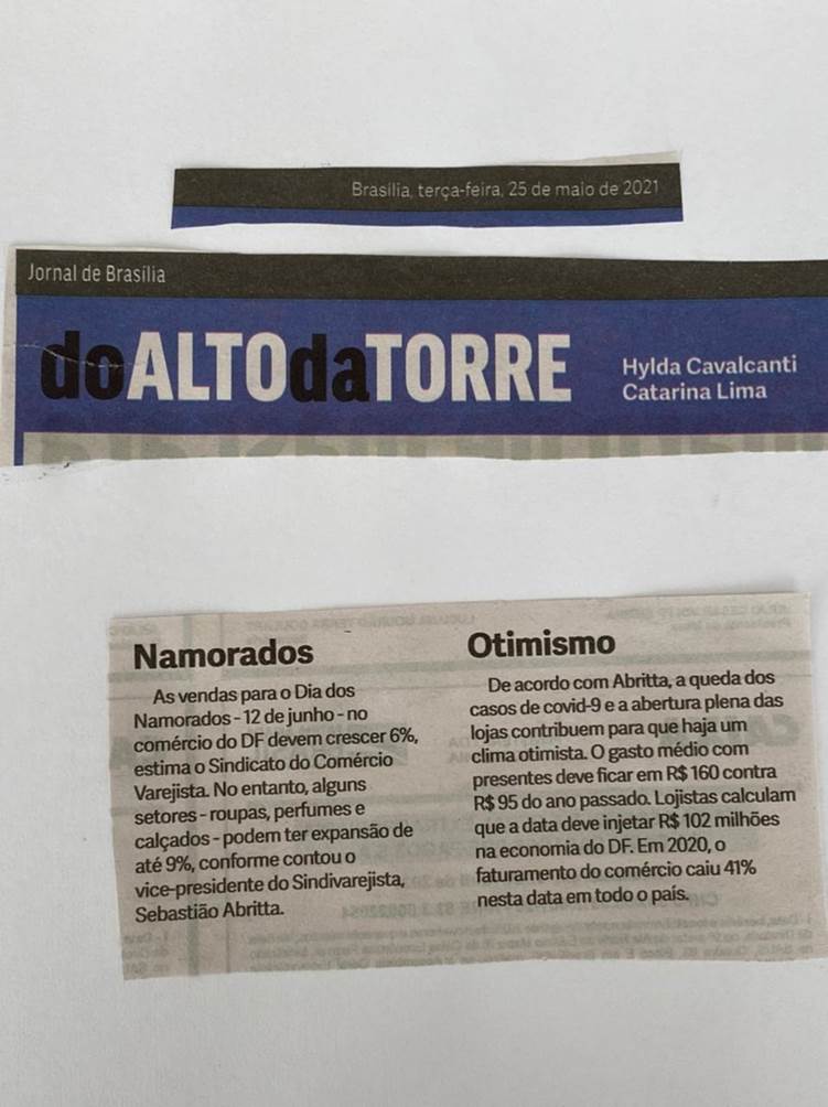 Do Alto da Torre: Nota sobre expectativa do comércio para o Dia dos Namorados com declarações do vice-presidente do Sindivarejista, Sebastião Abritta.