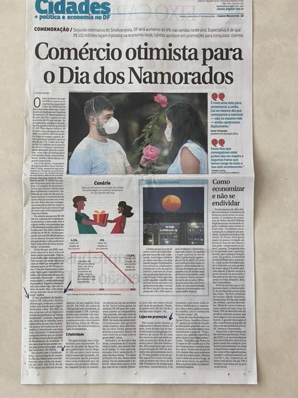 Matéria sobre vendas para o Dia dos Namorados, com declarações do vice-presidente do Sindivarejista, Sebastião Abritta.