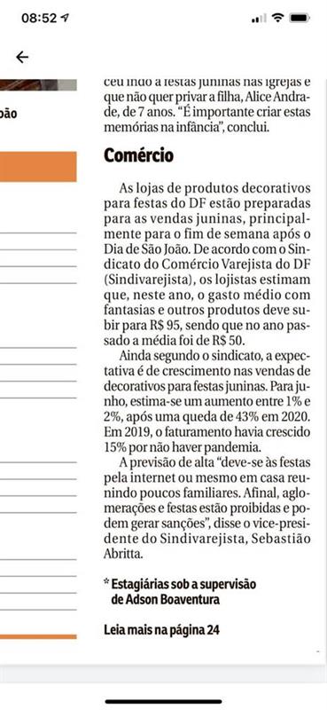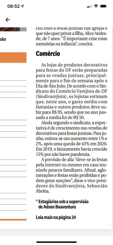 Matéria sobre festas juninas e vendas do comércio com declarações do vice-presidente do Sindivarejista, Sebastião Abritta.