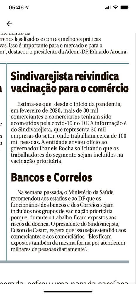 Capital S/A: Notas sobre pedido do Sindivarejista ao GDF para que comerciantes e comerciários sejam incluídos no grupo de vacinação prioritária.