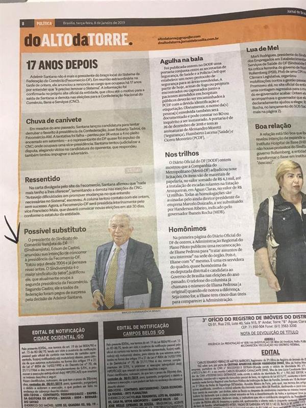 Coluna Do Alto da Torre: Matéria com menção a candidatura do presidente do Sindivarejista, Edson de Castro, a presidência da Fecomércio-DF.