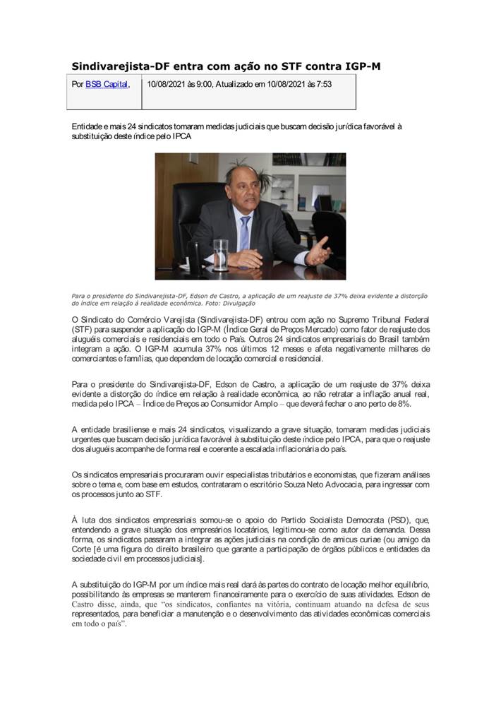 Matéria sobre ação no STF para mudar índice que reajusta aluguéis. Com declarações e foto do presidente do Sindivarejista, Edson de Castro.