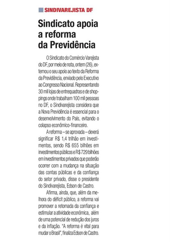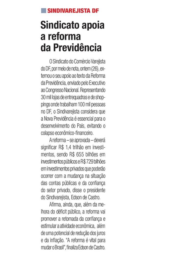 Matéria sobre apoio do Sindivarejista à Reforma da Previdência. Depoimento do presidente Edson de Castro.