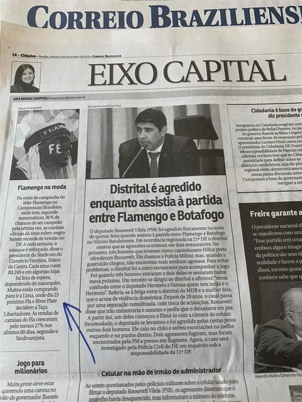 Nota sobre vendas de uniformes do Flamengo com menção ao presidente do Sindivarejista, Edson de Castro.