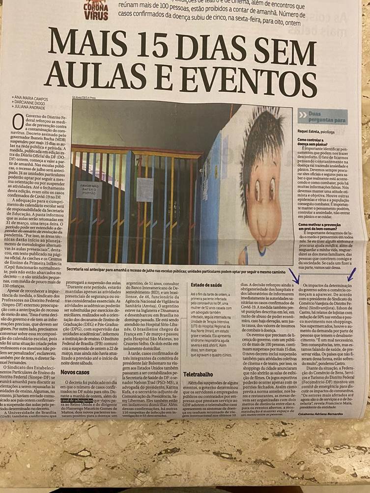 Mais 15 dias sem aulas e eventos. Matéria sobre o coronavírus em Brasília. O presidente do Sindivarejista, Edson de Castro, é um dos entrevistados.
